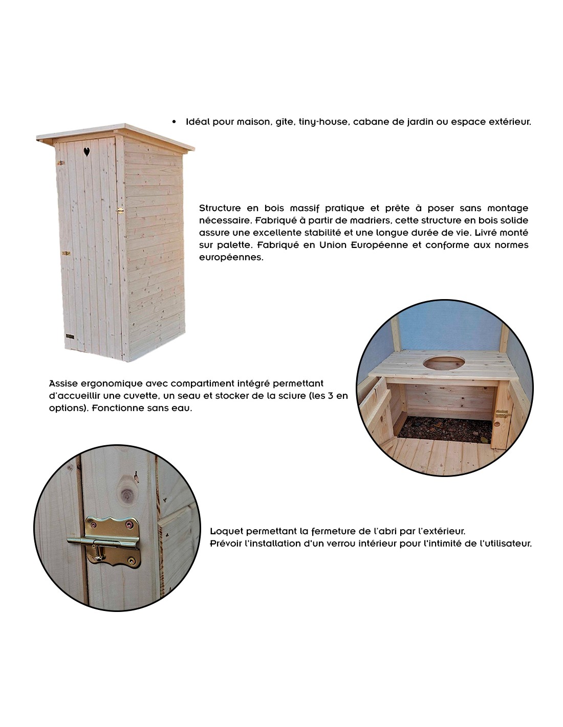 Cabine pour toilettes sèches en bois massif. Fonctionnement sans eau (pas de raccordement à l’eau et pas de chasse) simple, autonome et économique. Idéal pour maison, gîte, tiny-house, cabane de jardin ou espace extérieur.