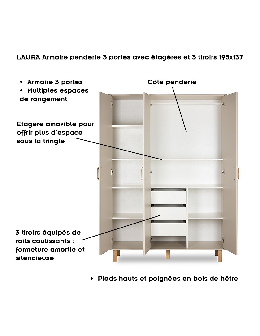 LAURA Armoire penderie 3 portes avec étagères et 3 tiroirs 195x137
