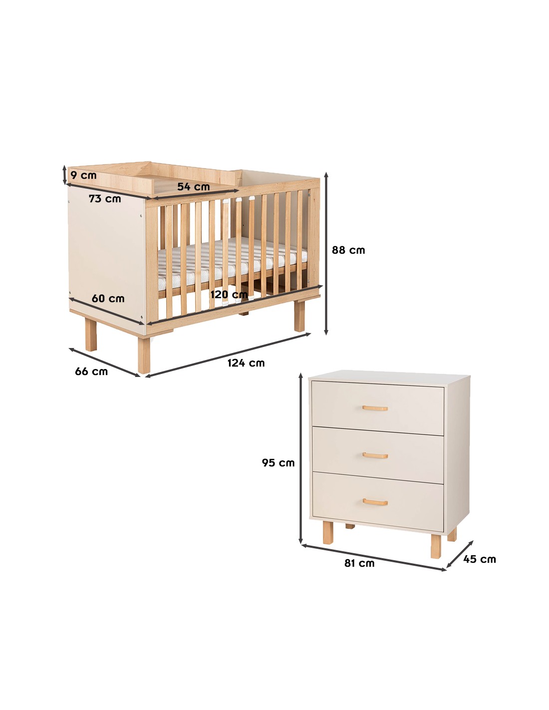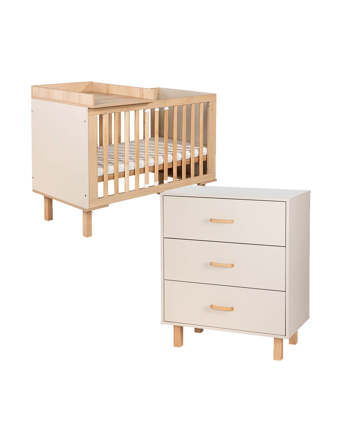 Cet ensemble est composé d’un lit à barreaux et d’une commode. Un plan à langer amovible pour le lit ou la commode est disponible, au choix. Pour le confort de bébé, il est préférable d'installer un matelas à langer sur le plateau (matelas à langer non inclus).