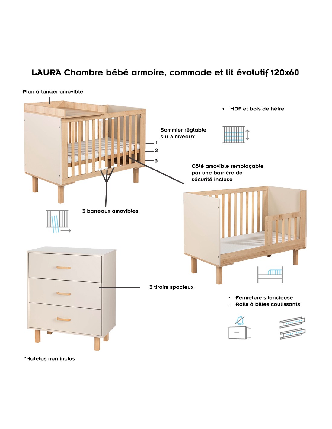 LAURA Ensemble bébé commode et lit évolutif 120x60