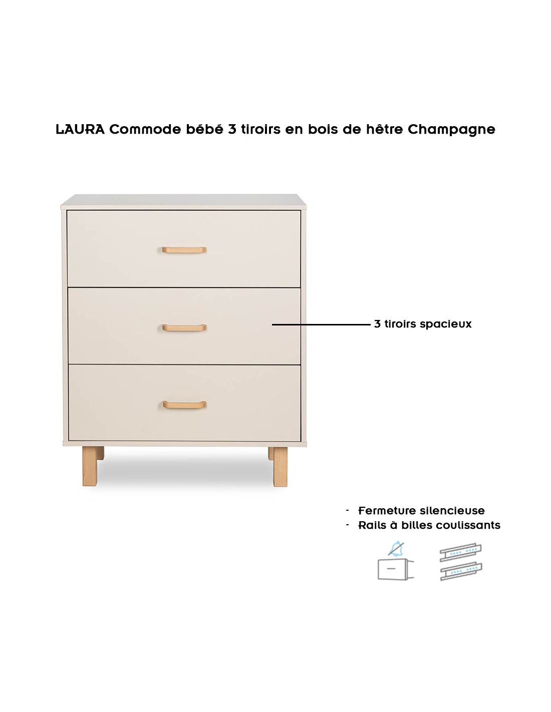 LAURA Commode bébé en bois de hêtre 3 tiroirs Champagne