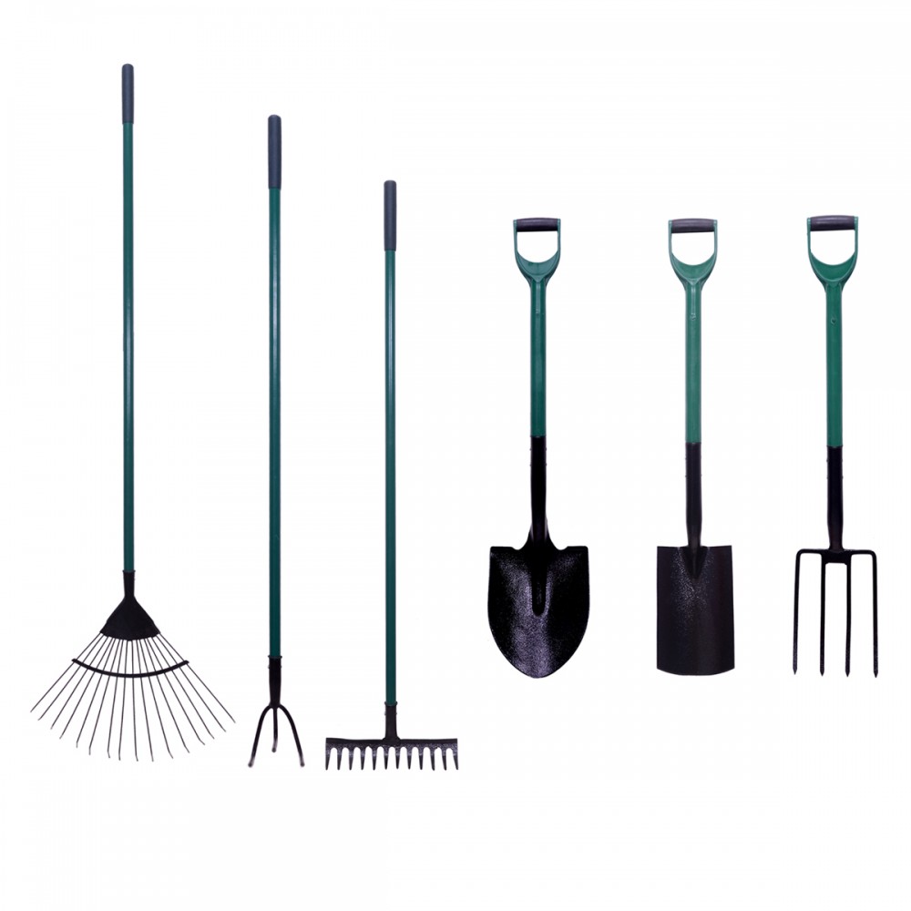 - Pelle, fourche, bêche, râteau, râteau à feuilles et griffe 3 dents.