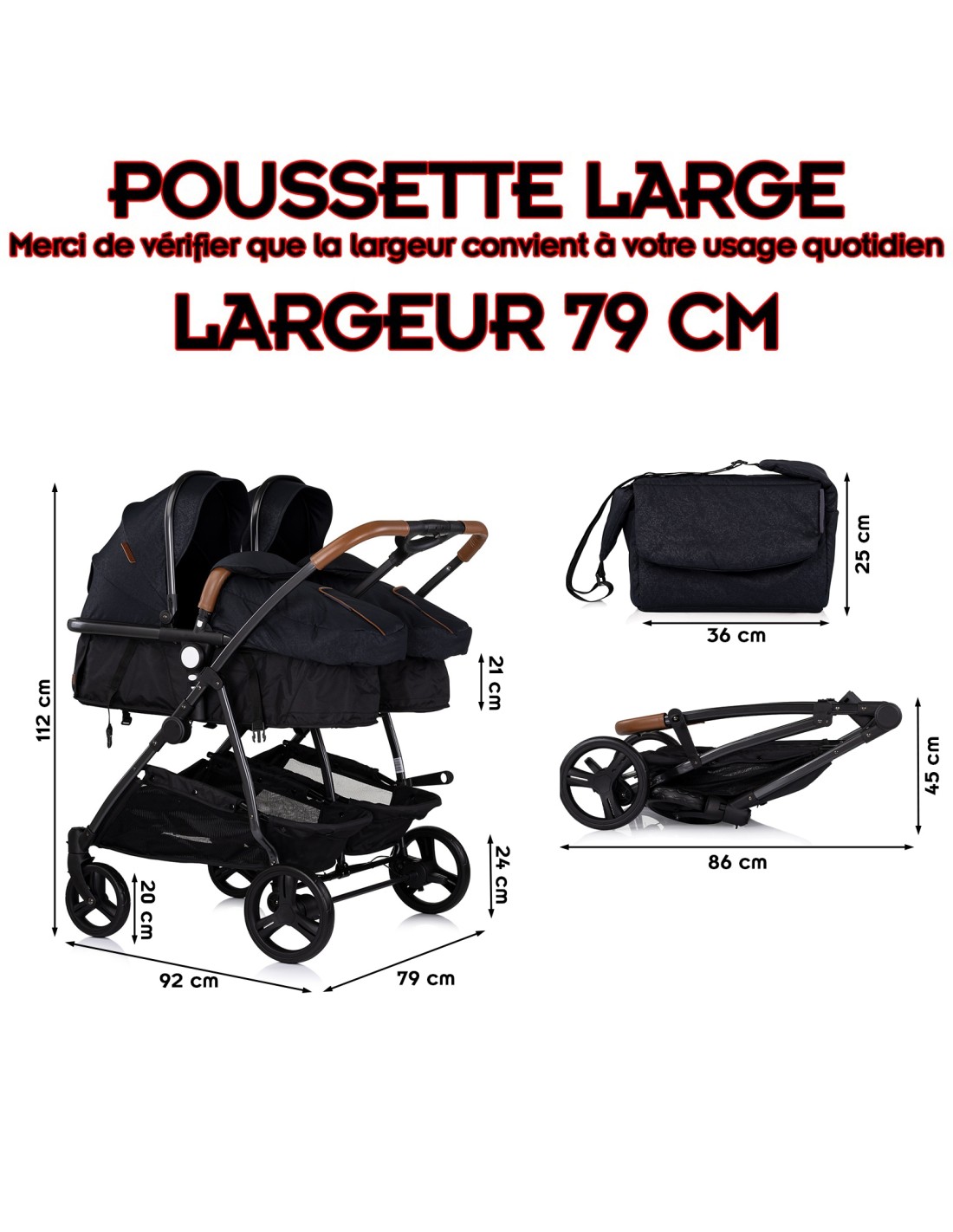 ATTENTION : CETTE POUSSETTE EST LARGE (LARGEUR 79 cm). MERCI DE VÉRIFIER QUE CELA CORRESPOND À VOTRE UTILISATION QUOTIDIENNE (PORTES, TRANSPORTS...)