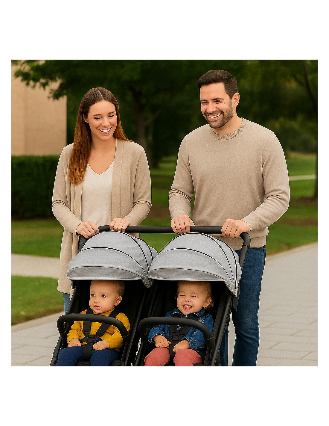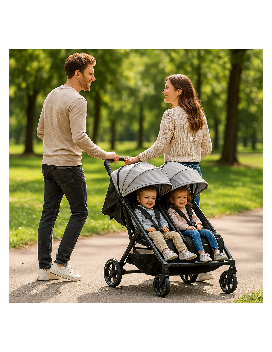 Cette poussette double et évolutive convient aux jumeaux et aux enfants d'âges rapprochés.